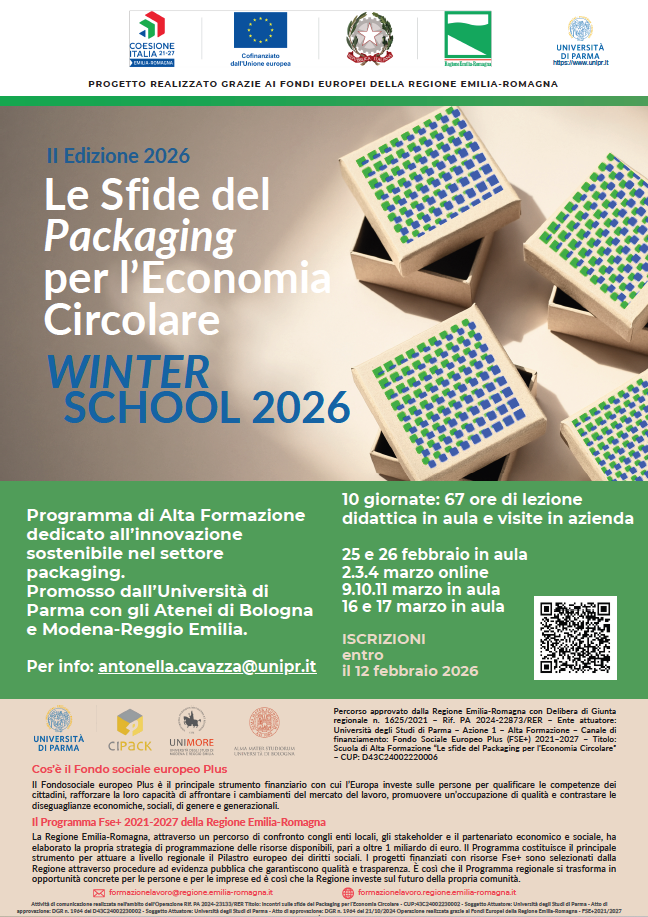 L’Università di Parma annuncia l’avvio della Winter School 2026 – Le sfide del Packaging per l’Economia Circolare, percorso di Alta Formazione finanziato dal Programma Regionale FSE+ Emilia-Romagna 2021–2027, dedicato ai professionisti e ai giovani laureati che intendono sviluppare competenze avanzate nel settore del packaging sostenibile; promosso dall’Università di Parma con le Università di Bologna e Modena e Reggio Emilia.